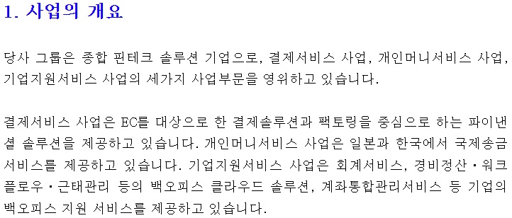 각 사업 부문별 매출 비중은 국제송금서비스 50%, 결제서비스 사업 40% 등임.