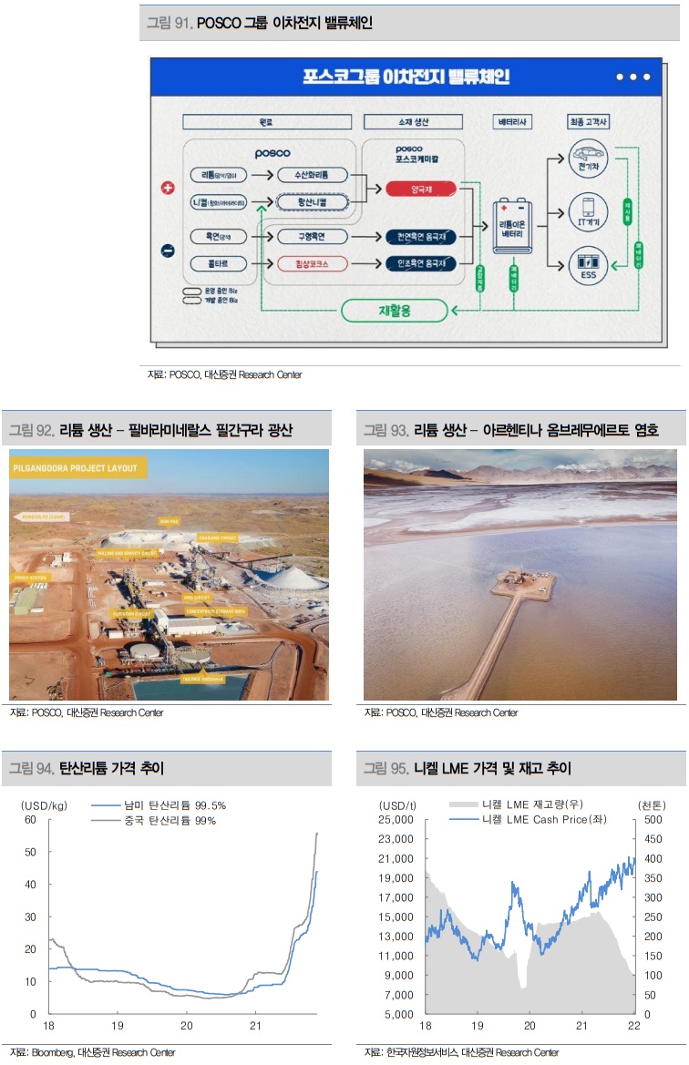 POSCO는 그룹 내에 배터리셀 제작 이전의 소재 밸류체인을 모두 갖추고 있다는 점에서 이차전지 소재 분야에서 국내 철강업종 내 가장 앞서 있다고 봐도 좋은 업체이다. 자회사로 증시에 상장해 있는 포스코케미칼은 양극재, 음극재를 생산하여 배터리셀 업체로 납품하는 국내 주요 소재업체이다. 양극재, 음극재의 생산원료인 리튬, 니켈, 흑연 등은 POSCO가 생산·조달하고 있기 때문에 투자자들의 적극적인 관심이 필요하다.