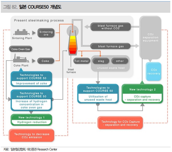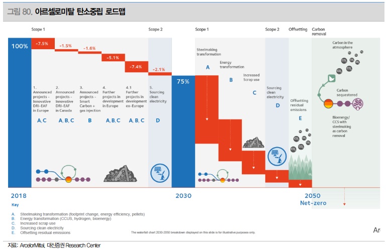 현대제철은 2030년 탄소배출 20% 저감, 2050년 탄소중립 목표를 세운 상태이다. 현대제철의 경우 전기로 비중이 높기 때문에 POSCO 대비 상대적으로 좀 더 유연한 전략이 가능하다. 현대제철은 현시점에서 전기로 설비를 급하게 확대해야 할 유인은 없기 때문에 당장 설비투자를 통해 전기로 숫자를 늘리기보다는, 향후 전기로 비중 확대 시기를 대비하여 연구개발 투자를 바탕으로 대체원료, 고급강 제조기술 등을 확보하는 상황으로 판단된다.