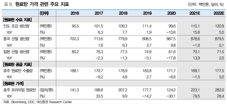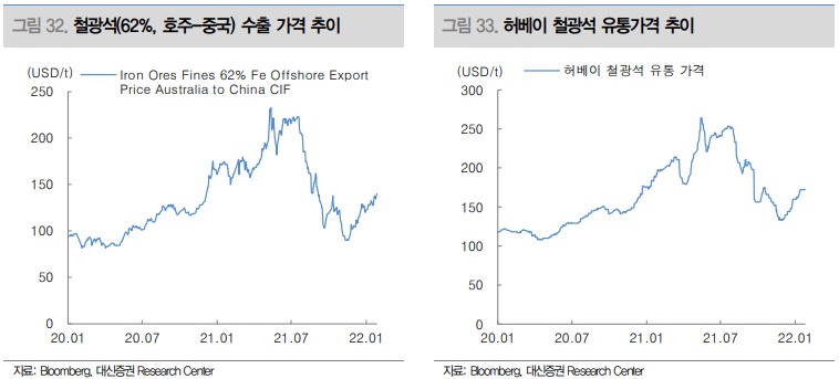2022년 철광석 평균 가격은 톤당 127달러(-21.4% yoy)를 예상한다. 당초 올해 철광석 가격 전망은 수요 대비 주요 광산 공급 증가로 인해 수급상 하락할 가능성이 높다고 점쳐졌었다. 다만 최근 광산업체들이 발표하는 2022년 생산계획이 보수적인 편으로, 발레(Vale)의 2022년 철광석 생산계획은 3.2억톤~3.35억톤(2021년 3.2억톤, +2.3% yoy)으로 시장 전망치(3.46억톤) 대비 낮으며, 호주 리오틴토(Rio Tinto) 역시 3.2억톤~3.35억톤(2021년 3.22억톤, +1.7% yoy)으로 증가폭이 크지 않다.
