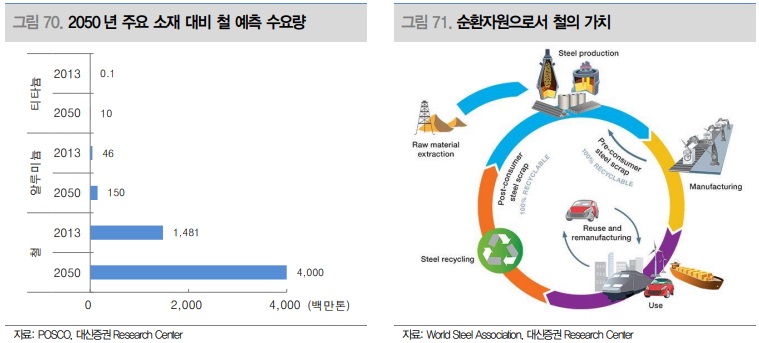 철강금속 산업이 현재 수준의 생산 설비규모에서 수요변화에 따라 사이클을 반복하게 된다고 가정하면, 앞으로 종목별 성장 및 주가 차별화를 결정지을 포인트는 미래 먹거리 투자 진행상황과 그 성과가 될 것으로 전망한다. 이익규모를 기준으로 과거치와 비교하여 산출하는 밸류에이션이 투자시장에서 설득력을 갖기가 점점 더 어려워지는 것이 사실이며, 시장에서 원하는 변화를 선점하는 것이 기업의 경쟁력을 판단하는 근거가 되고 있다. 그 변화는 철강산업에서는 생산 효율화를 통해 추가 마진을 확보하는 동시에 환경규제 준수능력을 높여나가는 것이 주가 될 것이며, 본업의 연장선 상에서 바라보면 향후 성장성이 높은 산업으로의 소재 공급능력을 갖춰나가는 것이다.