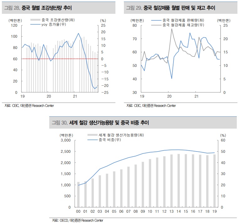 2022년 실물경제는 With 코로나 시대로 진행되며 정상화되는 흐름을 보일 가능성이 높으며, 조강 수요 역시 중국을 제외한 국가들에서 여전히 견조한 수요 증가가 나타날 것으로 예측한다. 다만 조강 수요 측면에서 고려해야 하는 주요 변수는 1) 코로나19 변이바이러스 확산 여부와 2) 중국 부동산 규제 정책에 따른 중국 건설 경기 반응 등 크게 두 가지가 있다고 판단한다.