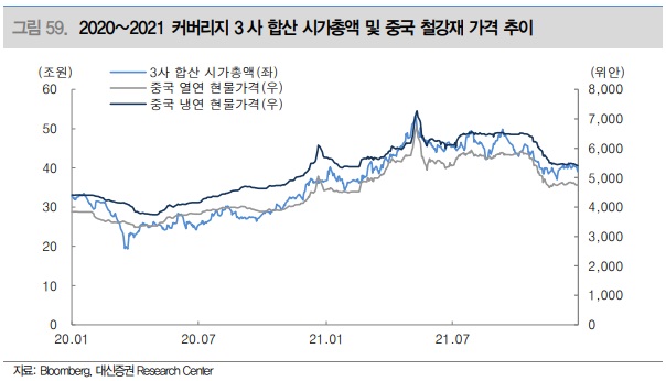 2021년 주요 국내 철강금속 업체 이익은 대부분 역대 최고 실적을 달성했거나 이에 근접하였으며, 가장 높은 밸류에이션을 받았던 2007년의 이익과 비교해도 1.5배 이상 높은 수준이다. 이에 비해 2021년 평균 PBR은 0.67배로 저점이었던 2019년 대비 다소 상승하기는 했지만 다운사이클 구간의 밸류에이션 수준에서 벗어나지 못하고 있다. 이로 미루어 볼 때, 이미 중국 철강재 가격과 국내 철강주의 동행성에 익숙해진 국내 시클리컬 투자자들이 2021년 실적을 이례적 상승으로 여기고 있으며, 중국 철강재 가격의 강한 추세 전환이 없는 이상 국내 철강주의 주가 회복이 쉽지 않다는 것을 방증한다.