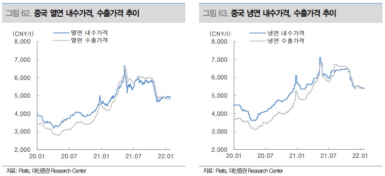 2021년 2차례에 걸친 중국 수출증치세 환급 폐지 이후 수출가격과 내수가격 간 괴리는 많이 좁혀진 상황이며, 추가로 중국은 수출 관세까지 인상할 조짐이다. 중국 내 수요를 만족하는 선에서 수출을 위한 추가 생산은 원치 않는다는 중국 정부의 의도는 분명하다. 필요 이상의 생산을 중단함으로써 탄소배출을 저감 할 수 있을 뿐만 아니라 수출 유인을 제거함으로써 자국 내 철강 축적량도 증가시키는 방향으로 짐작된다. 국내로의 중국산 철강재 유입은 과거 대비 줄어들 예정이며 가격 인하 영향력도 제한적일 것이다.