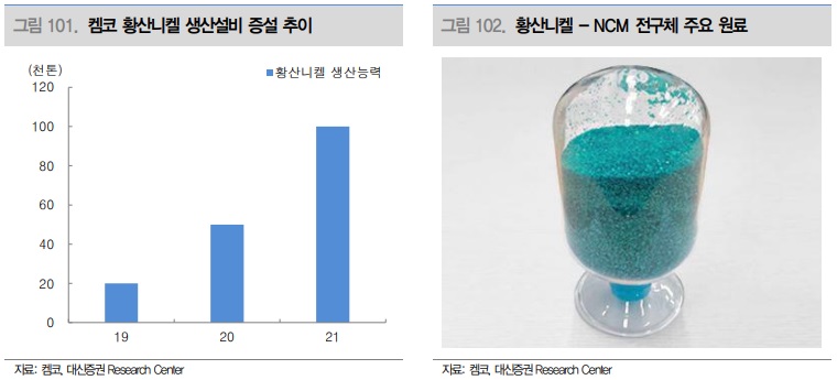 고려아연의 계열사인 ‘켐코’는 NCM(니켈, 코발트, 망간) 전구체의 원료로 사용되는 황산니켈 제조를 전문으로 하는 회사이다. NCM 전구체를 사용한 양극재는 현재 용량, 출력 측면에서 성능우위를 보이고 있는 하이니켈 배터리에 적용되고 있는데, 그 중에서도 니켈은 함량이 높아질수록 에너지 밀도가 높아지는 특성이 있어 이차전지 시장 내에서의 수요가 지속적으로 성장할 것으로 기대된다. 켐코는 현재 연산 10만톤 규모의 황산니켈 생산능력을 보유하고 있으며, 최근 1만6,000m² 규모 부지 매입을 완료하며 추가 증설을 예고하고 있다.