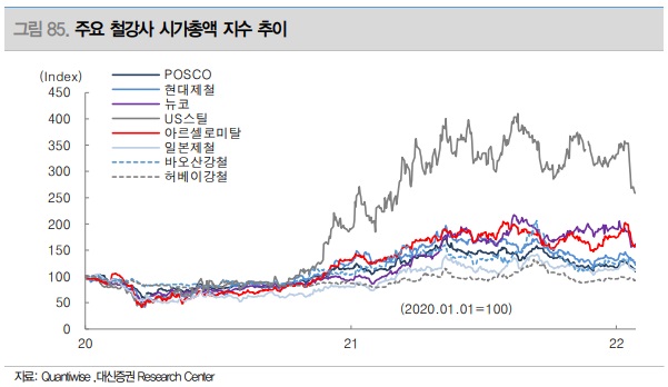2021년 국내 철강사들은 사상 최대의 분기 실적을 기록하는 등 호황을 보였음에도 주가는 과거 레벨 대비 현저히 낮은 수준에 머무르고 있으며, 외국 철강사와 비교해도 저평가를 받고 있다. 전반적으로 모든 철강사가 실적 호황을 누린 가운데, 서구권 철강사 대비 동아시아 철강사들의 주가가 부진한 모습을 보였다. 가장 높은 PBR이 부여된 뉴코 1.66배 대비 한국 철강사들은 POSCO 0.42배, 현대제철 0.3배로 크게 저조한 모습을 보였으며, 이는 중국과 일본업체와 비교해도 낮은 밸류에이션이다.