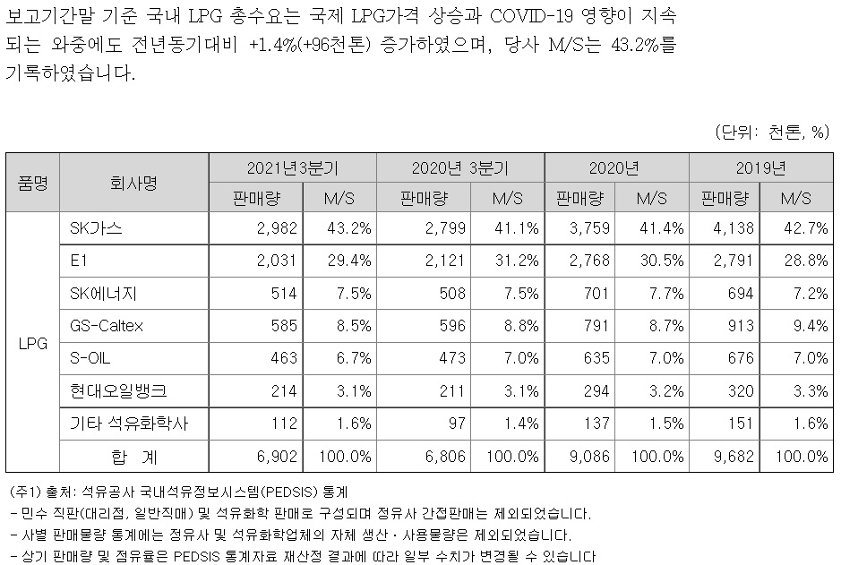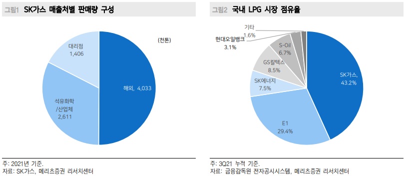 동사는 국내 1위 LPG 사업자로서, LPG 저장 탱크 등 기반시설과 트레이딩 능력을 바탕으로 해외에서 LPG를 도입하여 국내에 공급하는 사업을 영위하고 있다. 2021년 3분기 누적 기준 국내 시장 점유율은 43.2%이다. 동사가 공급하는 LPG는 석유화학/산업체에게 공급되거나, 대리점을 통해 가정/수송용으로 사용된다. 따라서 석유화학 업황 및 LPG 차량 운행량 등이 수요 변수로 작용하며, 또한 납사/LNG의 대체재로서의 성격이 있기에 상대 가격 추이 역시 판매량의 주요 변수이다. 최근 LNG 가격 강세에 따른 LPG 대체 수요가 증가하고 있는 이유이다.