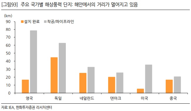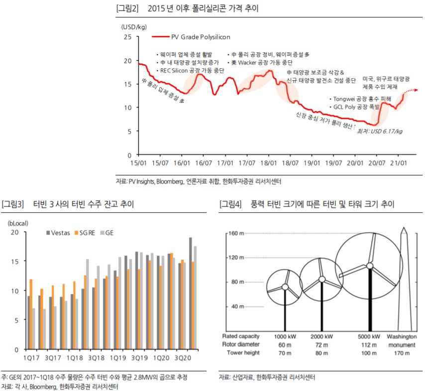 풍력, 태양광 모두 고성장이 예상되지만, 풍력보다는 태양광이 더 매력적으로 보인다. 태양광은 도시 인근에도 설치가 가능한 반면 풍력은 소음, 블레이드 크기 등의 문제로 도시 인근 설치가 어렵다. 특히 해상풍력의 경우에는 대규모 송배전 투자도 필요하다.