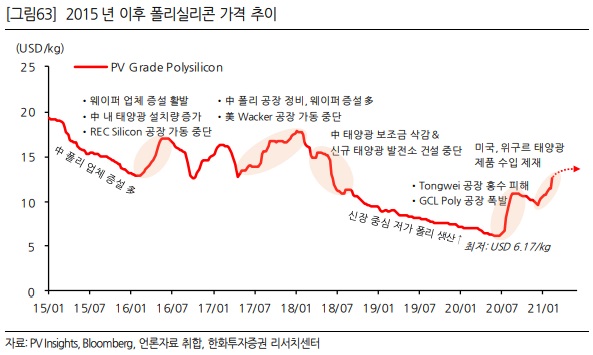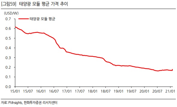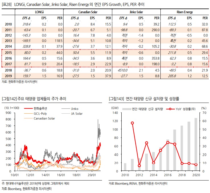 다만 태양광 업체들은 기업별 이익 체력과 재무구조, 설치량 등이 기업별로 상이하기 때문에, 밸류에이션 리레이팅이 산업 전반에서 이루어지지 않고 Top Tier 셀, 모듈 업체들에 집중되었다