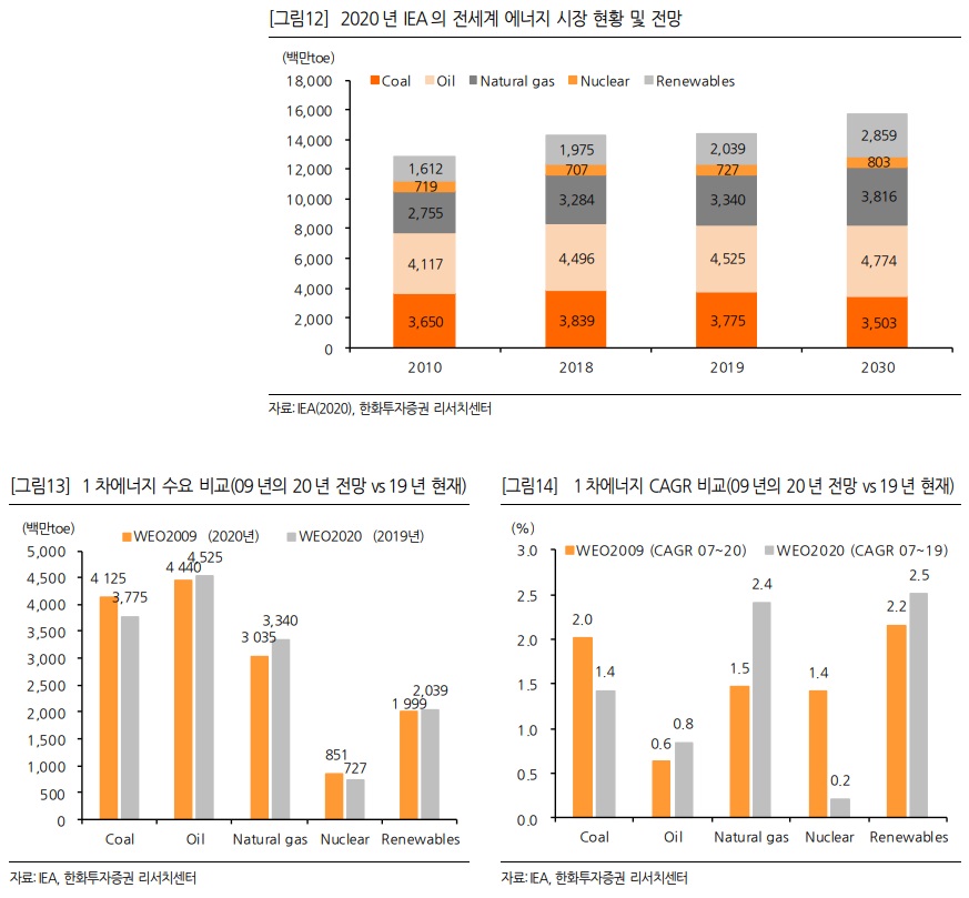 2009년 전망과 2020년의 에너지 수요가 달라진 주요한 이유는 ① 후쿠시마 원전 사고 이후 원자력에 대한 리스크 부각 ② 북미 셰일가스 개발 확대로 가스 가격 하락 ③ 석탄화력발전에 대한 금융지원 제한 ④ 신재생에너지의 발전단가 인하 등을 들 수 있다.