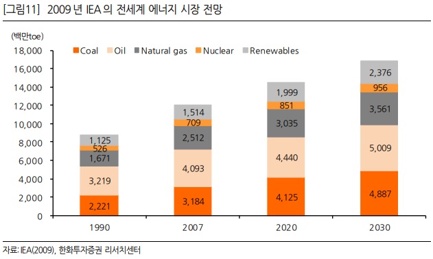 2009년 IEA가 발표한 전세계 에너지 전망(WEO2009) 자료에 의하면 1차 에너지(Primary Energy) 수요는 2007년부터 2020년까지 연평균 1.4% 증가하고, 에너지원별로는 신재생에너지가 연평균 2.2%, 석탄이 2.0% 증가할 것으로 전망했다. 전체 에너지 수요는 14,450Mtoe로 예상했다.