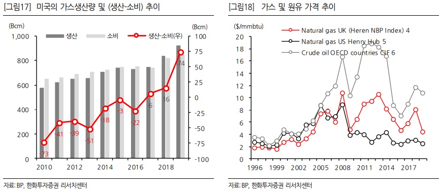 >> 미국 셰일가스 생산확대로 가스가격 하락 미국의 셰일가스 생산이 늘면서 가스가격이 하락했다. 미국의 가스 생산량은 2010년 575Bcm을 생산해 러시아에 이어 세계 2위의 가스 생산국이었으나, 2011년부터 러시아를 앞질러 2019년에는 러시아보다 241Bcm이나 더 생산했다. 국내 생산량과 소비량의 격차가 줄면서 미국의 가스 가격은 2010년 이후 하향 안정화됐다.