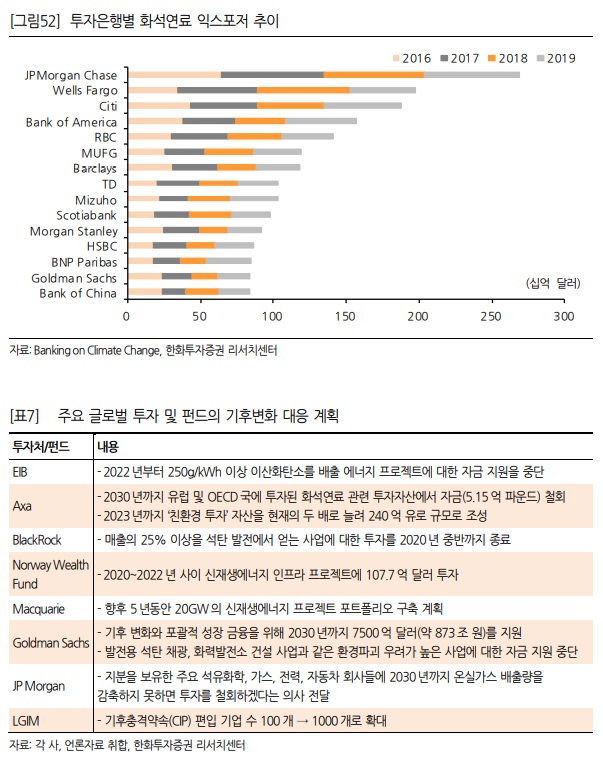 금융시장에서도 CO₂ 배출 기업에 대한 투자 제한은 강화되고, 친환경 기업에 대한 투자는 확대되고 있다. 유럽투자은행(EIB), 프랑스 AXA, 미국의 BlackRock, 골드만삭스, JP Morgan 등이 이러한 투자 트렌드를 선도하고 있다. 전세계적으로 ESG(환경, 사회, 지배구조: Environment, Social, Governance) 투자 규모도 2014년 18조 달러에서 2016년 23조 달러, 2018년 30조 달러까지 늘어났다.