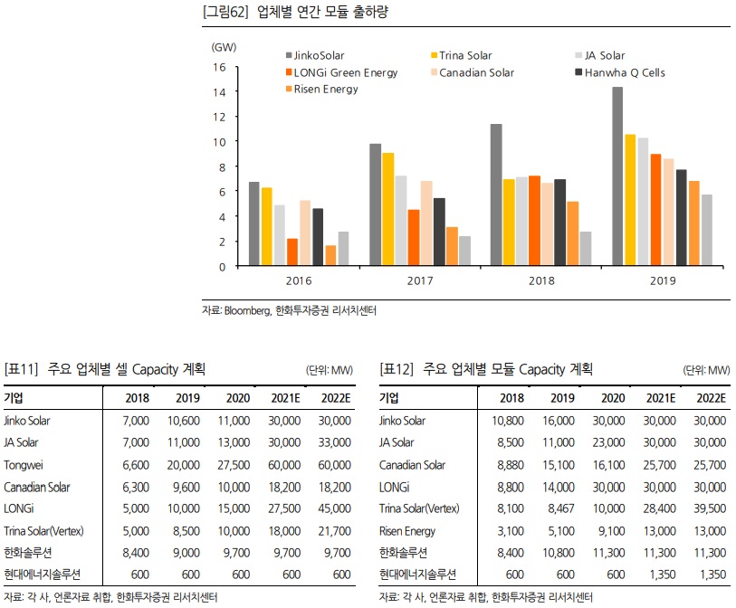 국내 태양광 업체들은 2019~2020년에 설비 증설이나 제품라인 변경을 완료했는데, 대체로 수요가 확보되고 이익률이 높은 모듈 라인을 중심으로 이루어졌다. 현대에너지솔루션은 750MW의 모듈 라인 증설을 완료했으며, 신성이엔지도 700MW의 모듈 공장을 개소함과 동시에 600MW 규모 셀 라인은 가동을 중단했다.