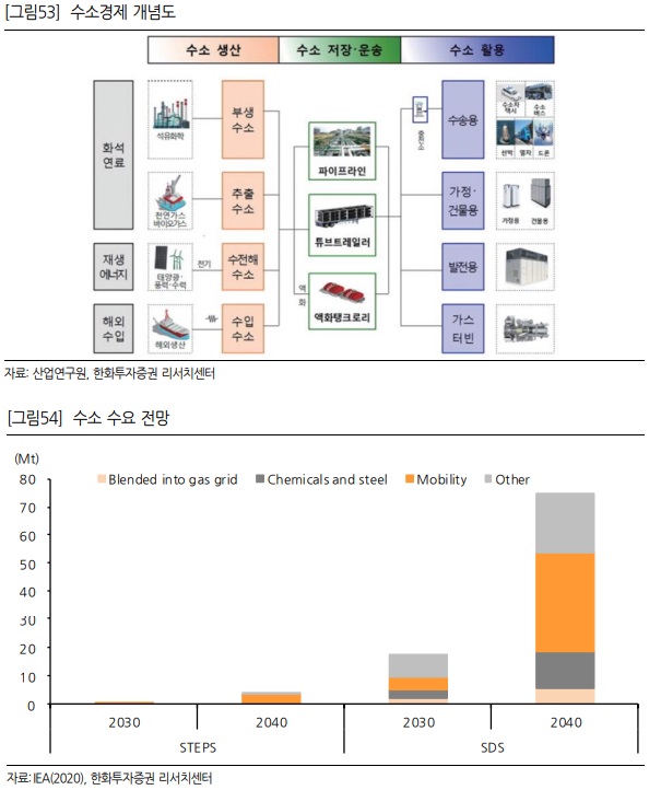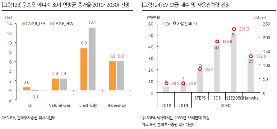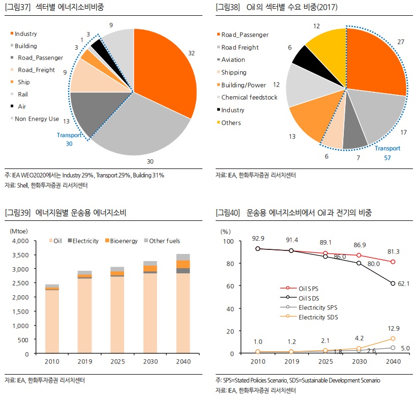 운송용으로 사용되는 Oil을 대체할 수 있는 에너지원은 전기나 수소 등이다. IEA가 제시한 두 가지 시나리오상 운송용 Oil의 비중은 2040년 최대 62%까지 감소하고, 전기와 바이오에너지 비중이 각각 12.9%, 16.3%(SPS 7.7%)로 높아질 것으로 전망했다. 운송용 전기와 바이오 수요는 2030년까지 연평균 12.3%, 11.5% 성장할 것으로 예상하고 있다.